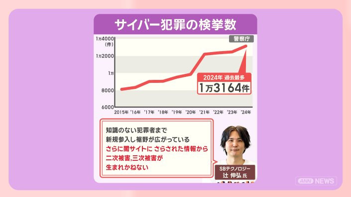 サイバー犯罪の検挙数は、年々増えて、2024年は過去最多の1万3164件です。