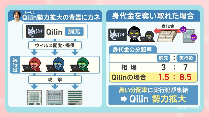企業などから、身代金が取れたら、その身代金をQilinと実行役で分けます。