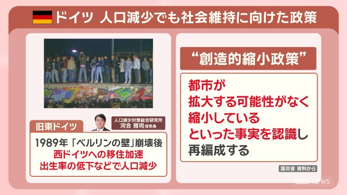 河合さんによると、旧東ドイツは、1989年の『ベルリンの壁』崩壊後、西ドイツへの移住が加速したこと、出生率の低下などで人口が減少しました。