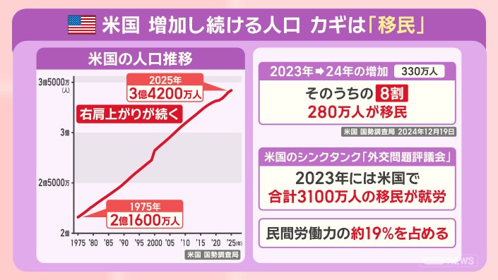 アメリカのシンクタンク『外交問題評議会』は、2023年にはアメリカで合計3100万人の移民が働いていて、民間労働力の、約19%を占めたということです。