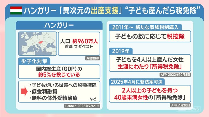 ハンガリーは少子化対策に、 国内総生産(GDP)の、約5%を、子どもがいる世帯への税額控除や低金利融資、 無料の体外受精治療などを含む家族形成を奨励する政策に投じています。