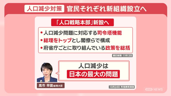人口減少問題に対応するため、政府は司令塔となる組織を新設する方針を固めました。