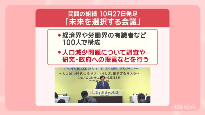 経済界や労働界の有識者など100人で構成され、人口減少問題について、調査や研究、政府への提言などを行う組織です。