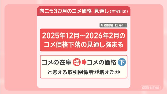 米穀機構によると、2025年12月から2026年2月のコメ価格は下落の見通しが強まっています。