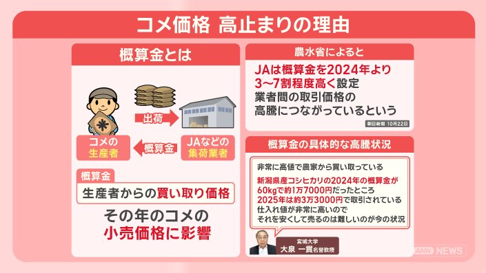 「非常に高値で農家から買い取っている新潟県産コシヒカリの2024年の概算金が60キロで約1万7000円だったところ、2025年は約3万3000円で取り引きされている。仕入れ値が非常に高いので、それを安くして売るのは難しいのが今の状況」と話しています。