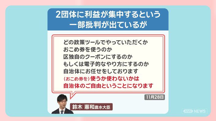 「どの政策ツールでやっていただくか、おこめ券を使うのか、区独自のクーポンにするのか、もしくは電子的なやり方にするのか、自治体にお任せをしております。(おこめ券を)使うか使わないかは自治体のご自由ということになります」と発言しています。