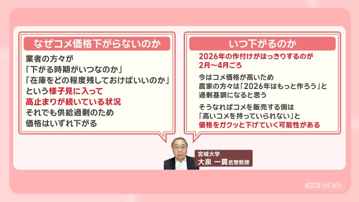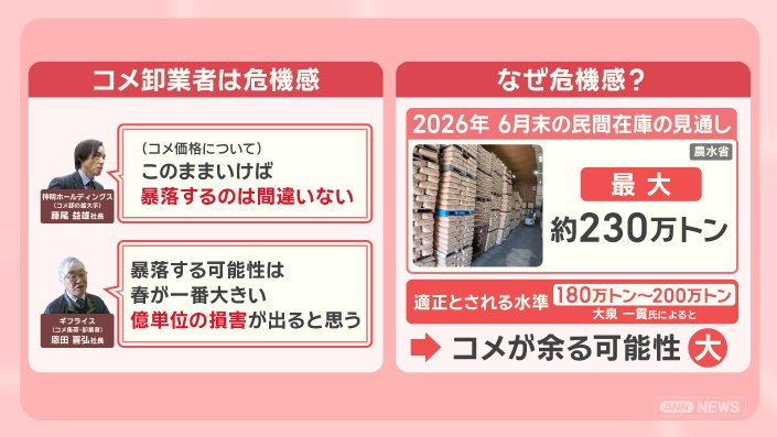 「2026年の作付けがはっきりするのが2月〜4月ごろ。今はコメ価格が高いため、農家の方々は『2026年はもっと作ろう』と過剰基調になると思う。そうなればコメを販売する側は『高いコメを持っていられない』と価格をガクッと下げていく可能性がある」