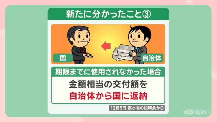 新たに分かったこと、3つ目は、期限までに使われなかった場合、金額相当の交付額を自治体から国に返納する、ということです。
