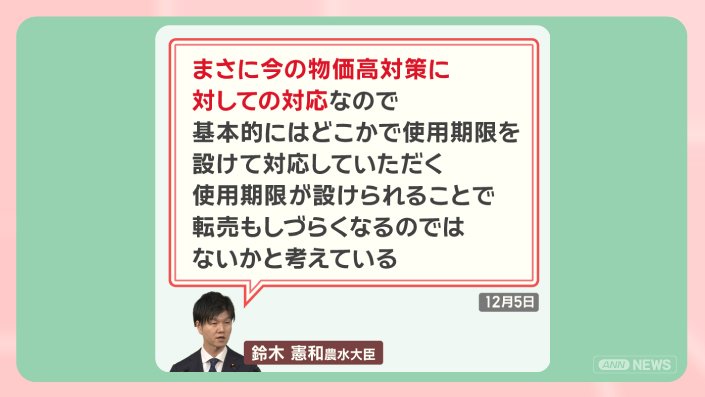 「まさに今の物価高対策に対しての対応なので、基本的にはどこかで使用期限を設けて対応していただく。使用期限が設けられることで転売もしづらくなるのではないかと考えている」