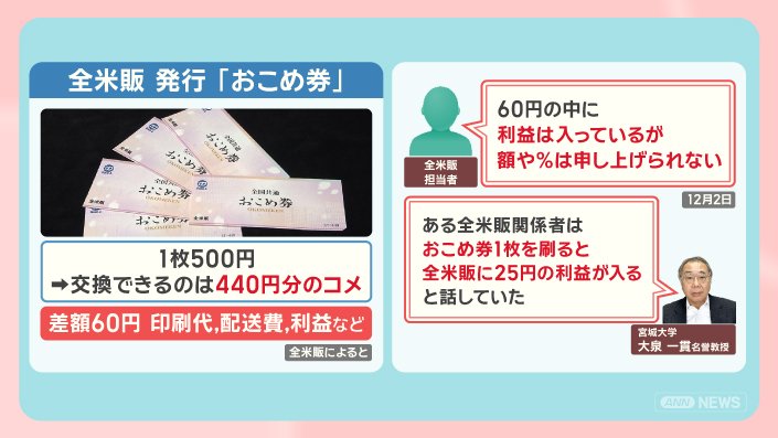 「ある全米販の関係者はおこめ券1枚を刷ると全米販に25円の利益が入ると話していた」