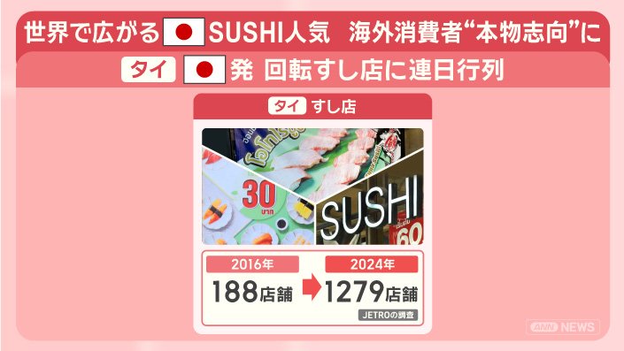 タイのすし店は、2016年は188店舗でしたが、2024年には1279店舗まで増えました。