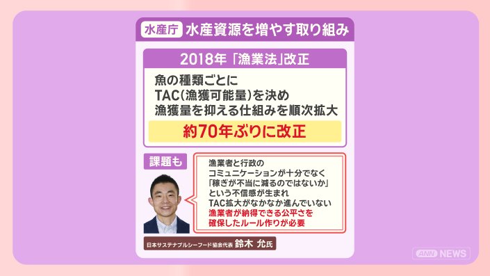2018年に『漁業法』が改正され、魚の種類ごとに漁獲可能量を決め、漁獲量を抑える仕組みを順次拡大しています。