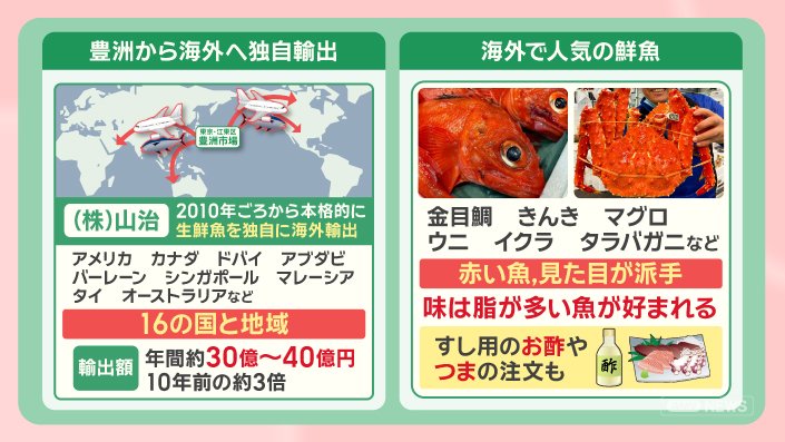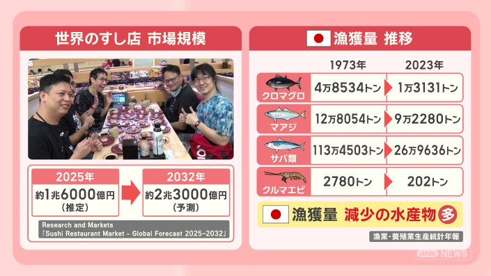 「日本の漁場は、海流の影響などで四季折々おいしい魚がとれる。しかも鮮度維持の技術や、高度に発達した流通システムがあるため、“日本産”は人気が高い。世界のすし需要が高まる一方、水産資源は減少しているため、日本の水産物は取りあいの状況になっている」