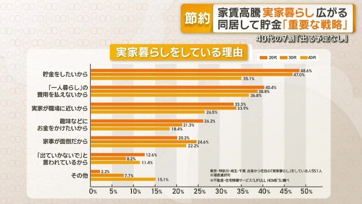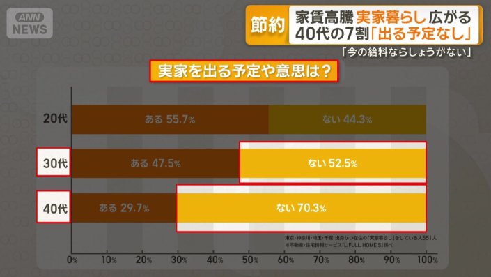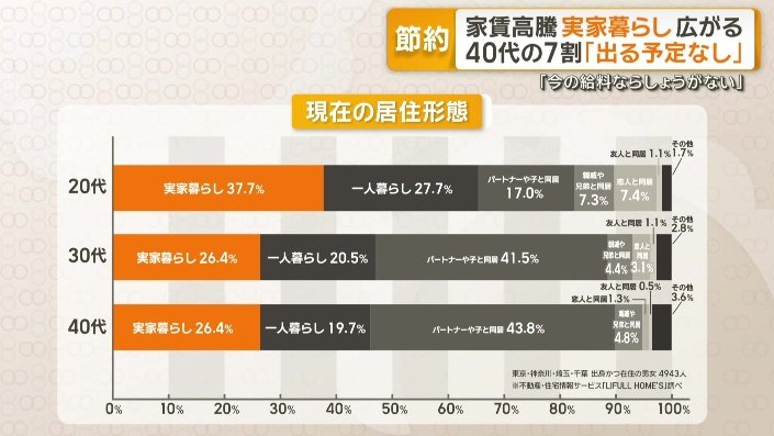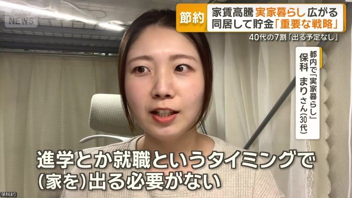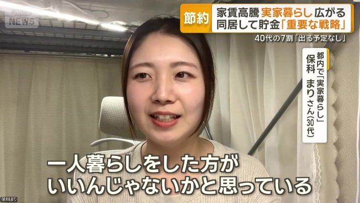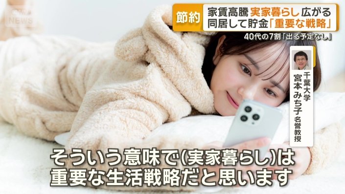 経済 グッド!モーニング 2025年9月19日 11:59 実家暮らしの年齢層広がる 40代の7割「出る予定なし」 物価高で節約志向に 2025年9月19日 11:59 千葉大学 宮本みち子名誉教授 広告 現在の居住形態 実家を出る予定や意思は? 実家暮らしをしている理由 広告 都内で「実家暮らし」保科まりさん(30代) 家賃折半、食事や洗濯も各々だが… シェア スクープ投稿 この記事を読む トップ 経済 ギャラリー