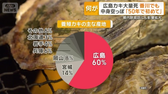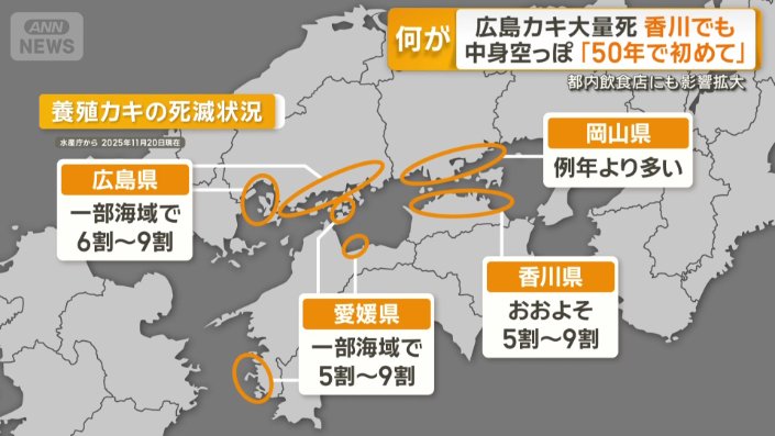 経済 グッド!モーニング 2025年12月8日 13:04 広島カキ大量死 中身空っぽ「50年で初めて」 香川でも被害 都内飲食店にも影響拡大 2025年12月8日 13:04 写真 (1/5) 瀬戸内海のカキ 写真の記事を読む 広告 写真 (2/5) 養殖カキの主な産地 写真の記事を読む 写真 (3/5) 「9割以上が死んでしまっていますね」 写真の記事を読む 写真 (4/5) 養殖カキの死滅状況 写真の記事を読む 広告 写真 (5/5) 「国、県、市と連携してスピード感を持って対応したい」 写真の記事を読む シェア スクープ投稿 この記事を読む トップ 経済 ギャラリー