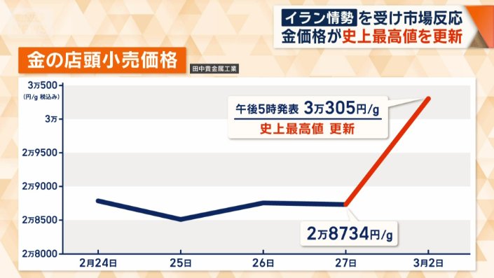 経済 ワイド!スクランブル 2026年3月4日 08:16 国内でも金の取引価格が急騰 史上最高値を更新 戦火広がるイラン情勢を受け市場反応 2026年3月4日 08:16 写真 (1/3) イランの反撃を受けたイスラエル・テルアビブ 写真の記事を読む 広告 写真 (2/3) 一時1ドル=157円台まで下落 写真の記事を読む 写真 (3/3) 金の店頭小売価格 写真の記事を読む シェア スクープ投稿 この記事を読む トップ 経済 マネー・くらし ギャラリー