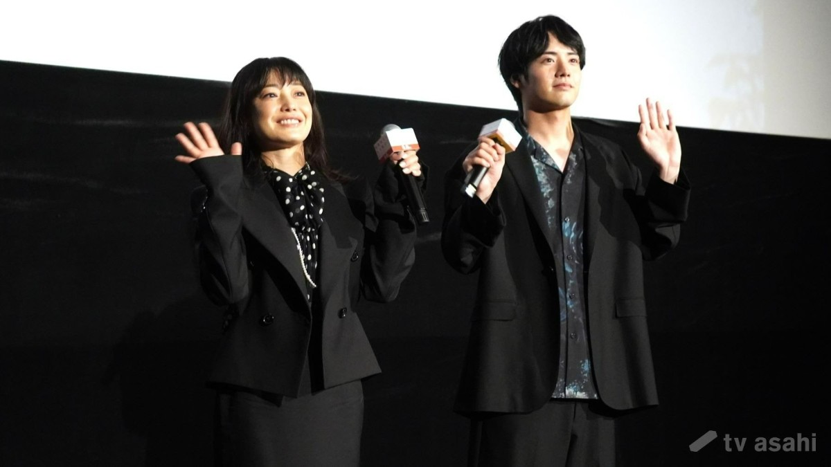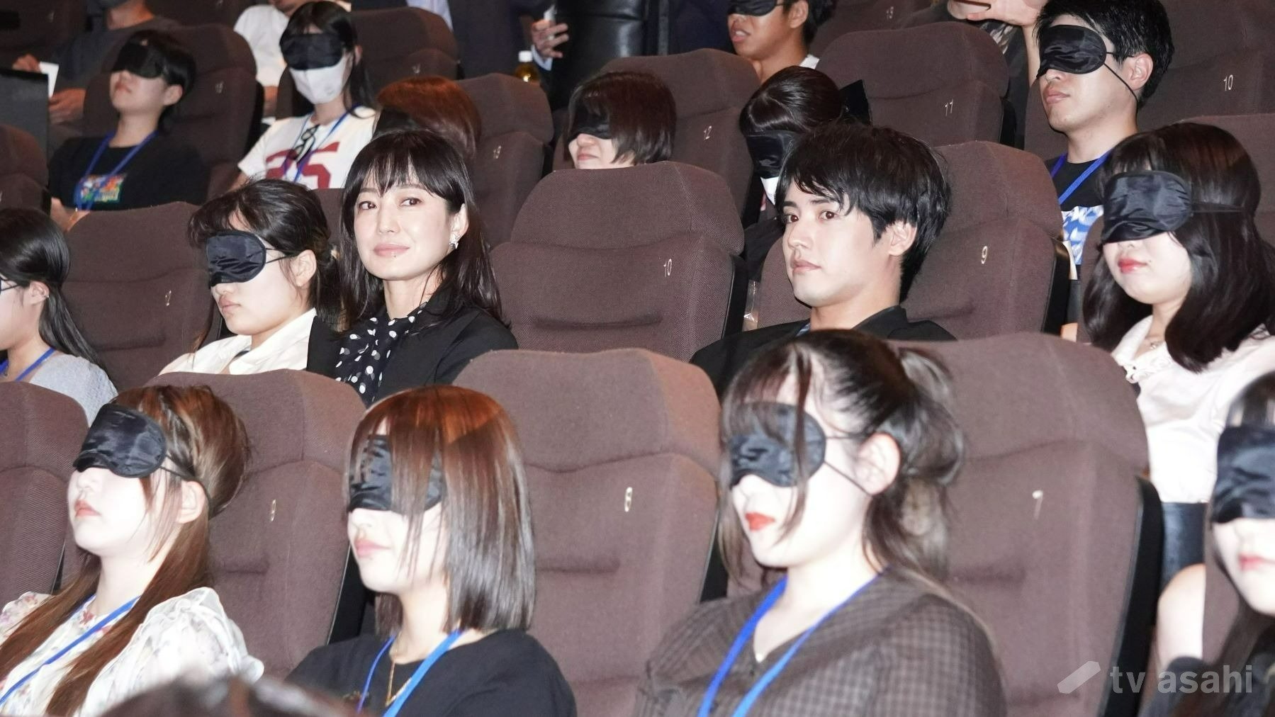 選ばれた者のみが体験できるミステリー・バスツアーイベントの終着点には、ダブル主演を務めた菅野美穂と赤楚衛二が。バスツアー参加者たちは目隠しをした状態で待機。