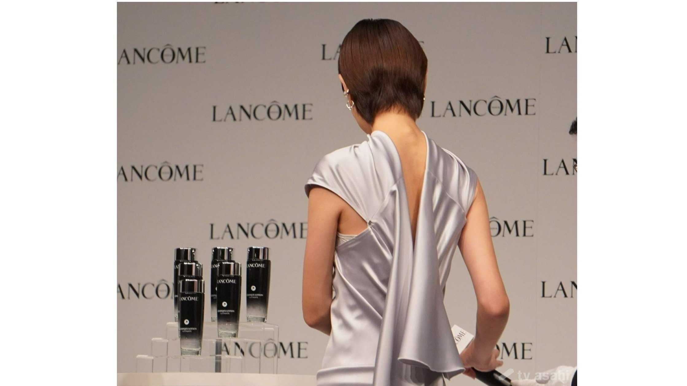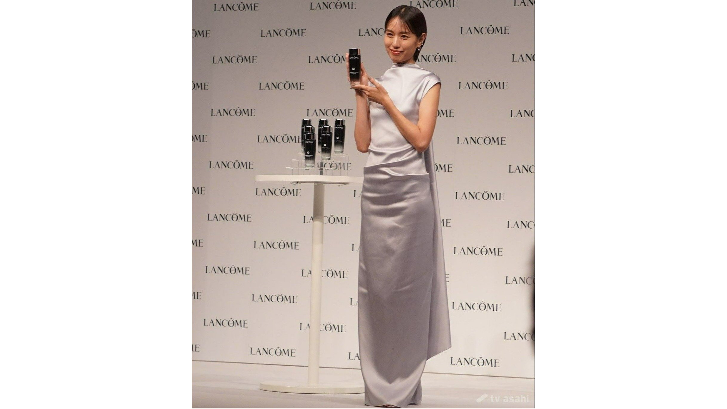 ランコムのジャパンアンバサダーを務める戸田恵梨香は、光沢があるシルバーのドレスで登場。ランコムについて「気品があって可憐で美しいイメージある。長い歴史あるランコムが世界で確立されていて、芯のぶれない強さをものすごく感じています」と語った。