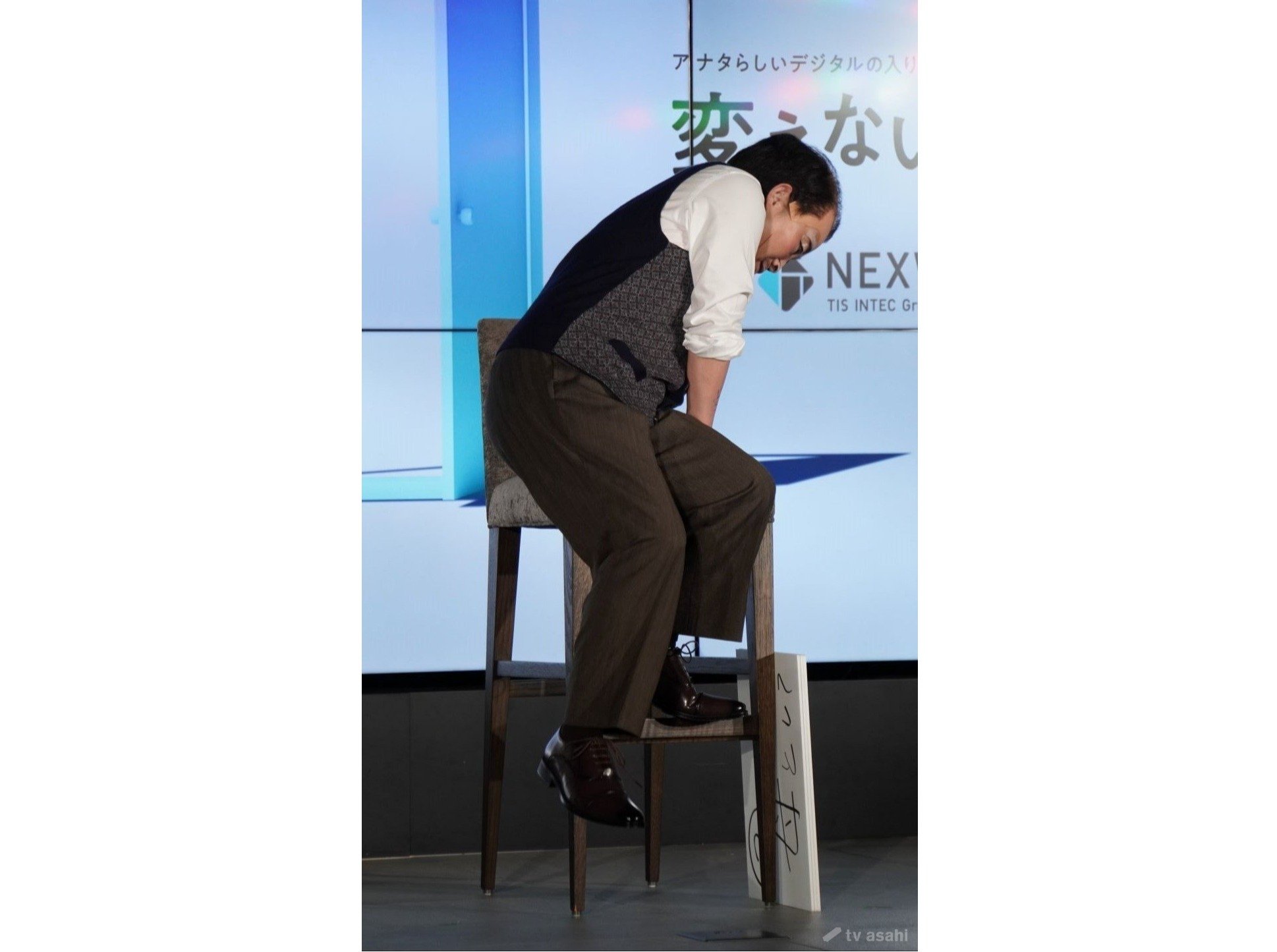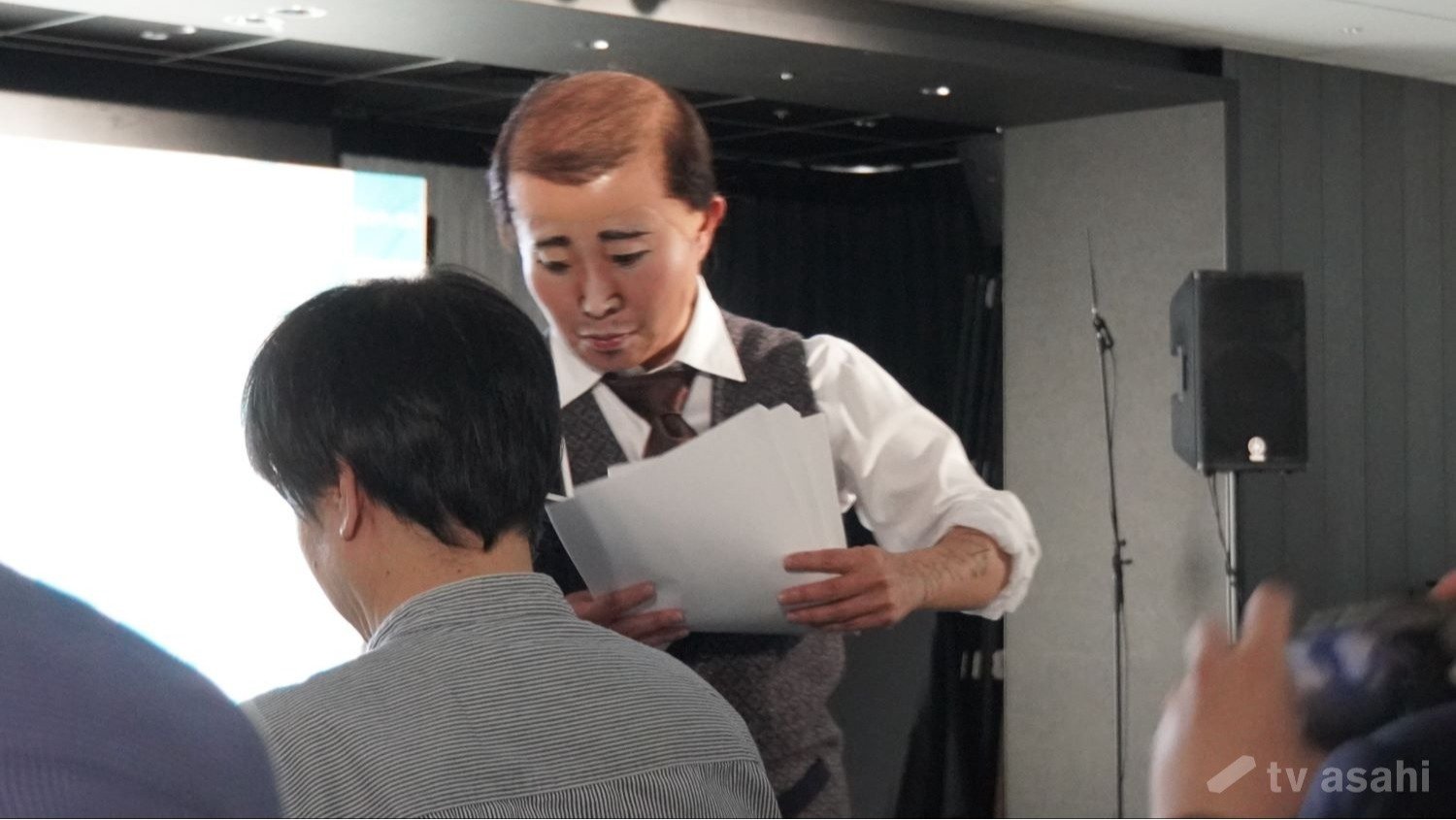 新キャラクターの酒田光男の名刺を配るキンタロー。だが、「大きい方がいいだろう」とコピー用紙で名刺を作って来ていた。