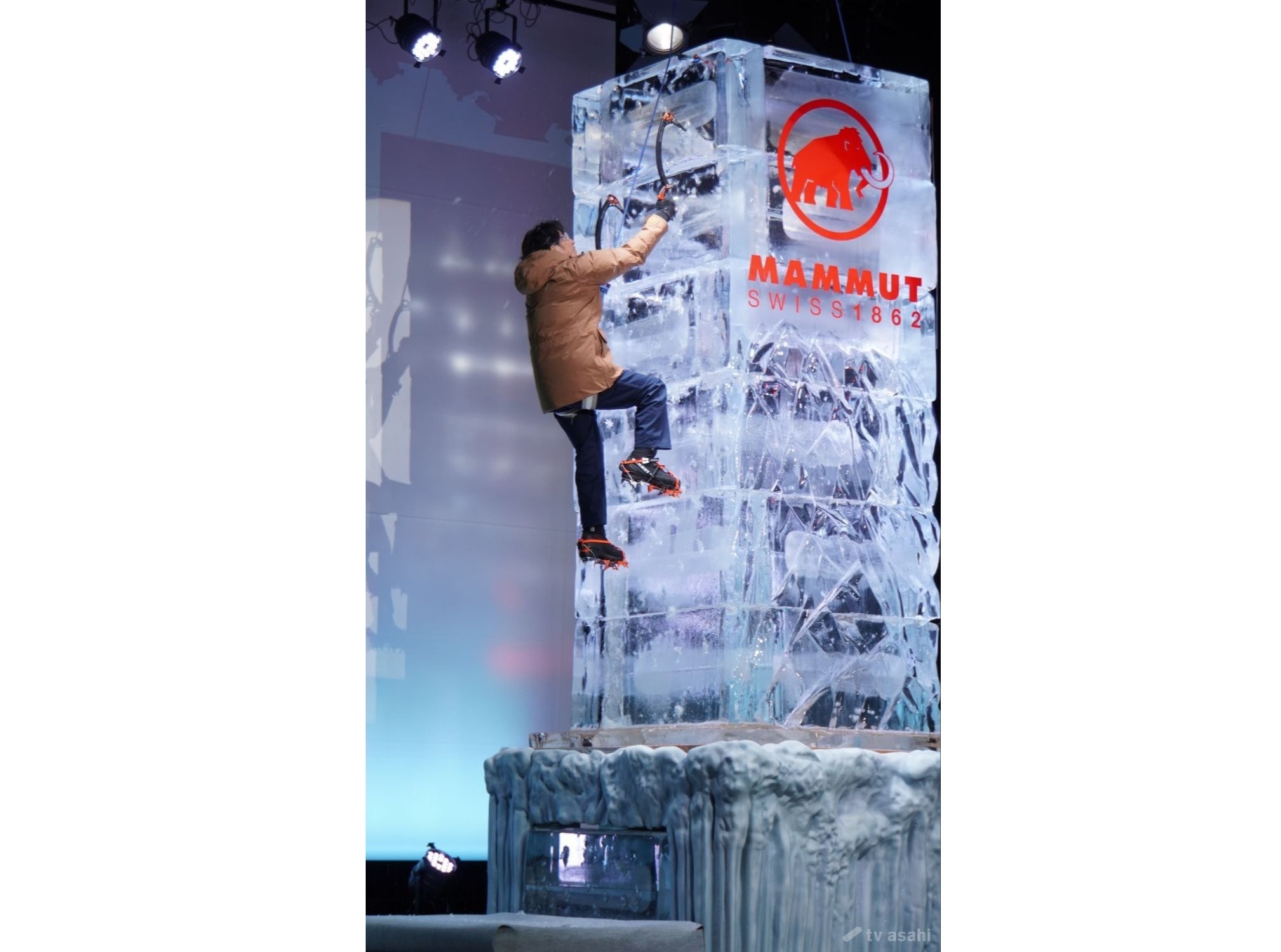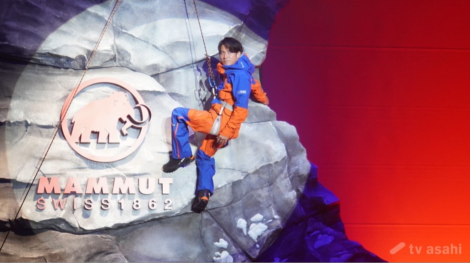 まずは「アイガー北壁」を再現した約4.5mの頂上から垂直降下して登場する岡田。もうスイスイです。