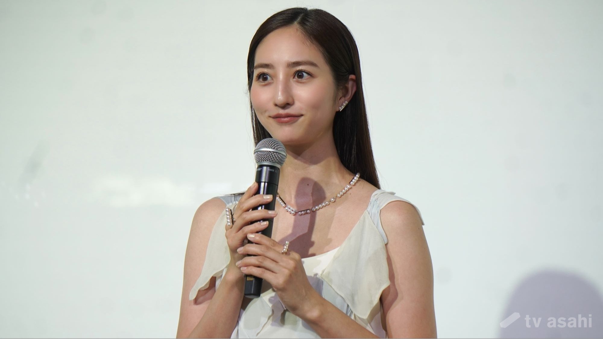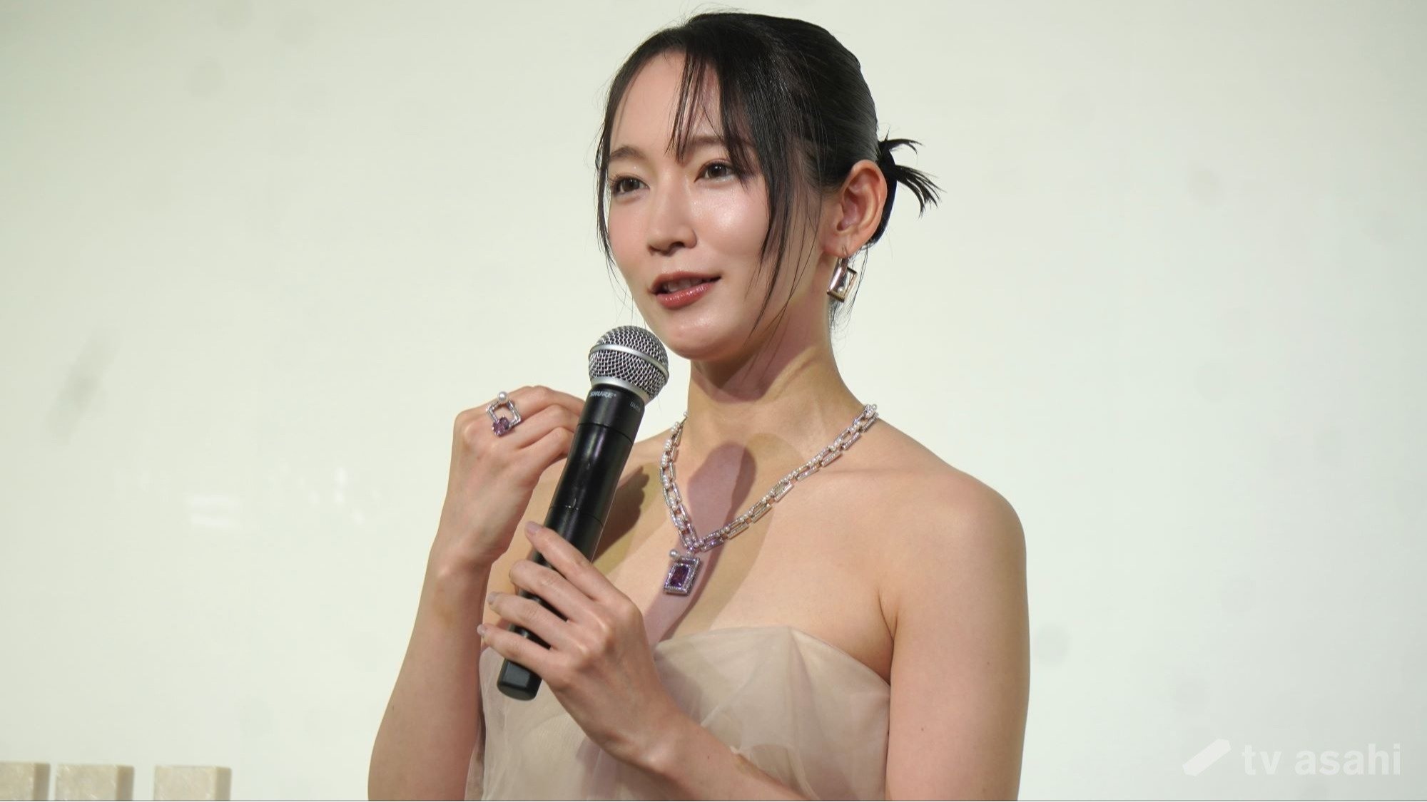 瀧本美織、堀田茜、吉岡里帆の3人は、それぞれが着けているTASAKIの最新フレグランスのインスピレーションとなったジュエリーで登場。ネックレス、イヤーカフ、リングを身に着けた瀧本は「TASAKIの養殖場でとれた、最高峰のパールを着けさせていただいています。イヤーカフとリングは、波のうねりとか、波の流れをイメージしていて、今日の香水とも合っています」とアピールした。