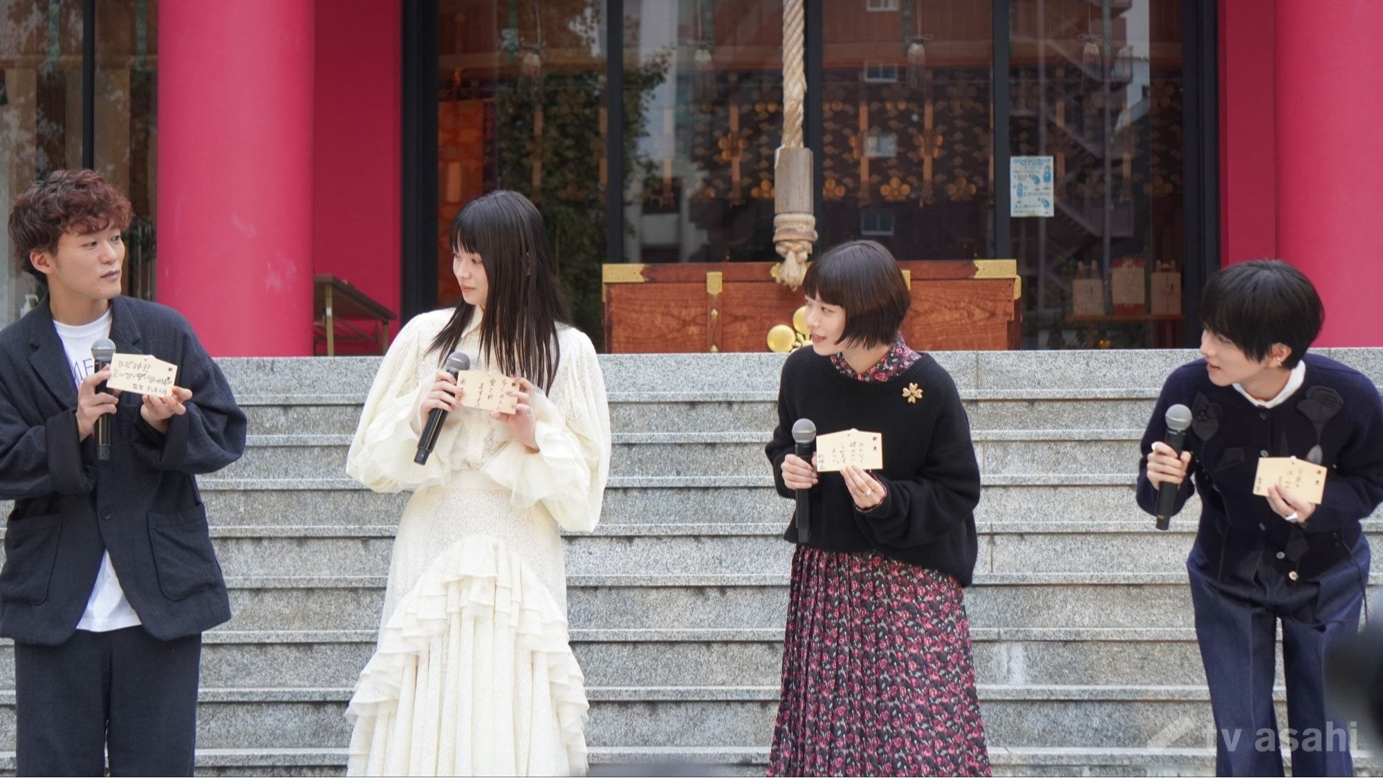 大ヒット祈願イベントとあり、この日は神社でイベントを行った。それぞれ絵馬に願い事を書いて発表することになり、他の3人の願い事を見た板垣李光人は「みんなすごい真面目。書き直していいですか?」と焦っている様子。