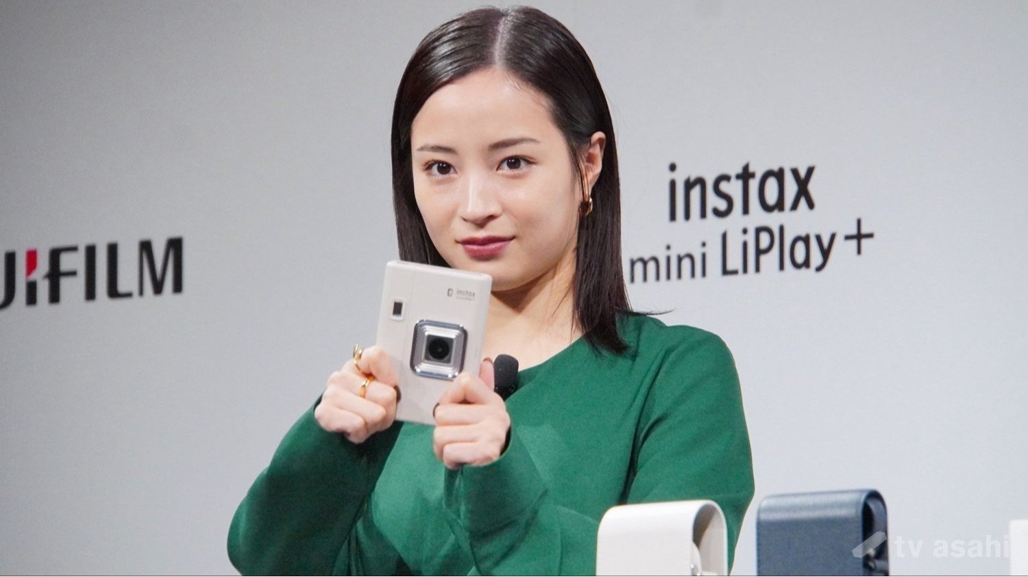 11月7日発売のハイブリッドインスタントカメラ「instax mini LiPlay+」を手に登場した広瀬。目力強めで新製品を掲げた。