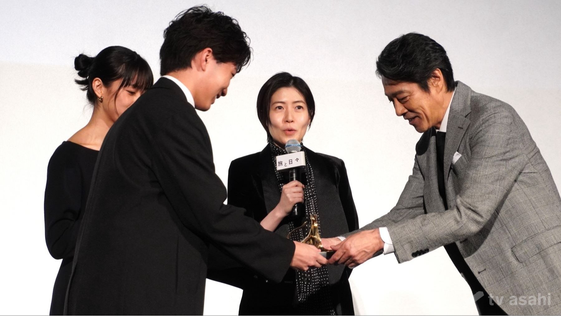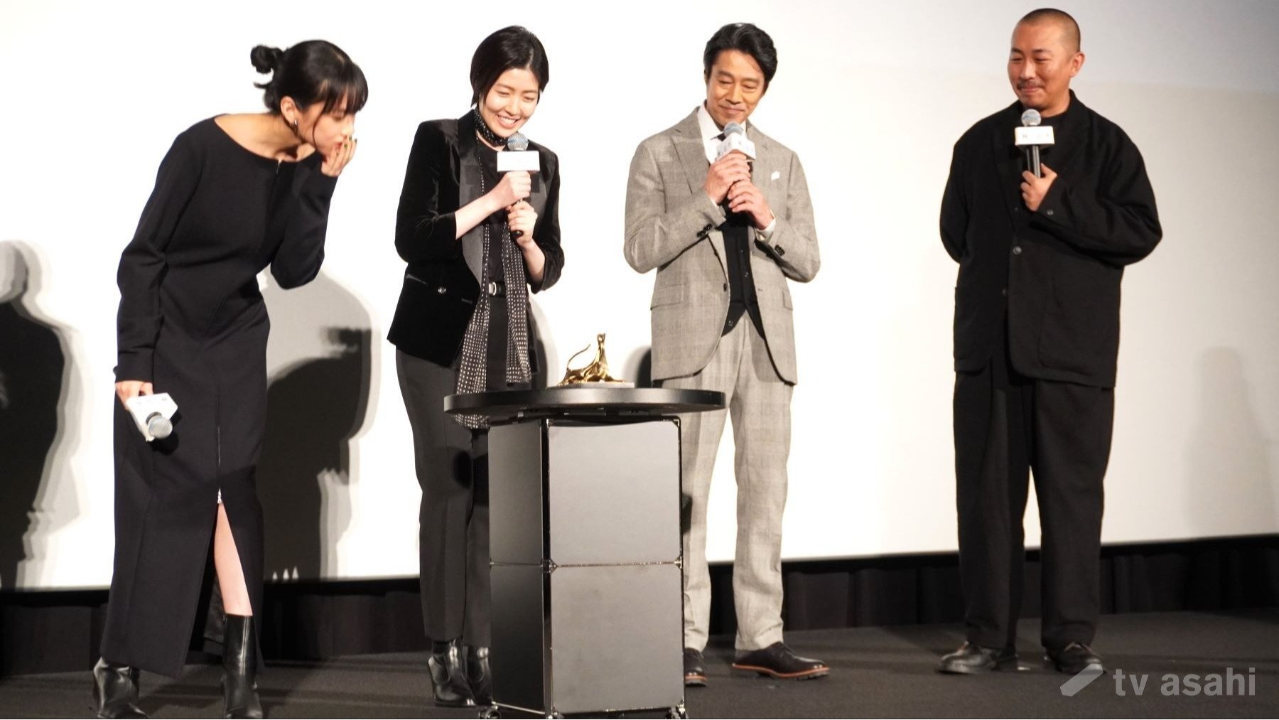 第78回ロカルノ国際映画祭の金豹賞のトロフィーが舞台上に登場し、興味津々なシム・ウンギョン、河合優実らキャスト陣。