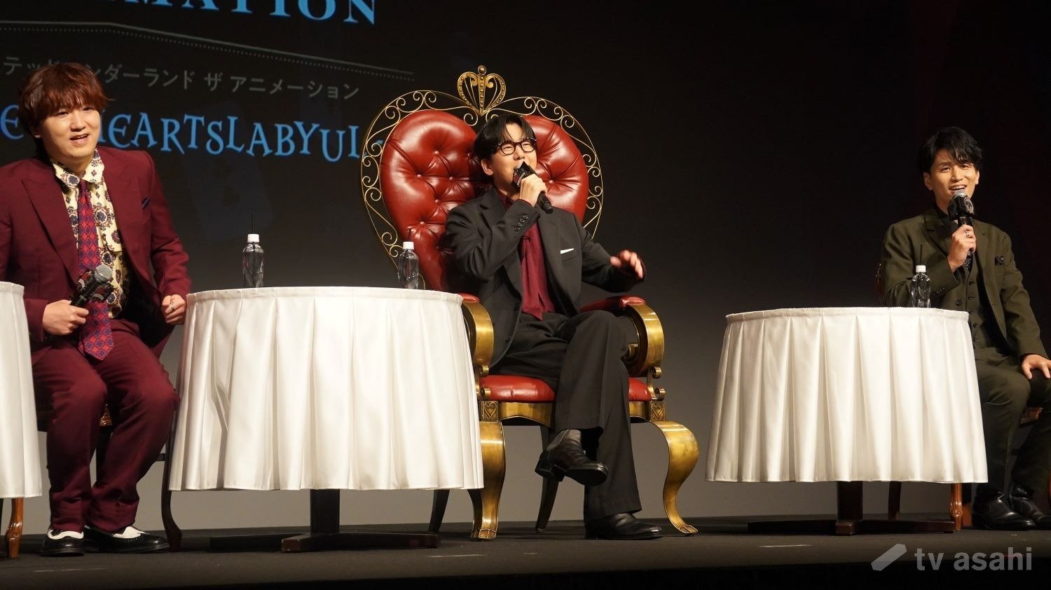 花江夏樹は「ディズニー ツイステッドワンダーランド ザ アニメーション」で、寮生から恐れられるハーツラビュル寮長リドル・ローズハートの声優を務めた。この日は、登壇者の中で一人だけハートモチーフの豪華なイスが用意された
