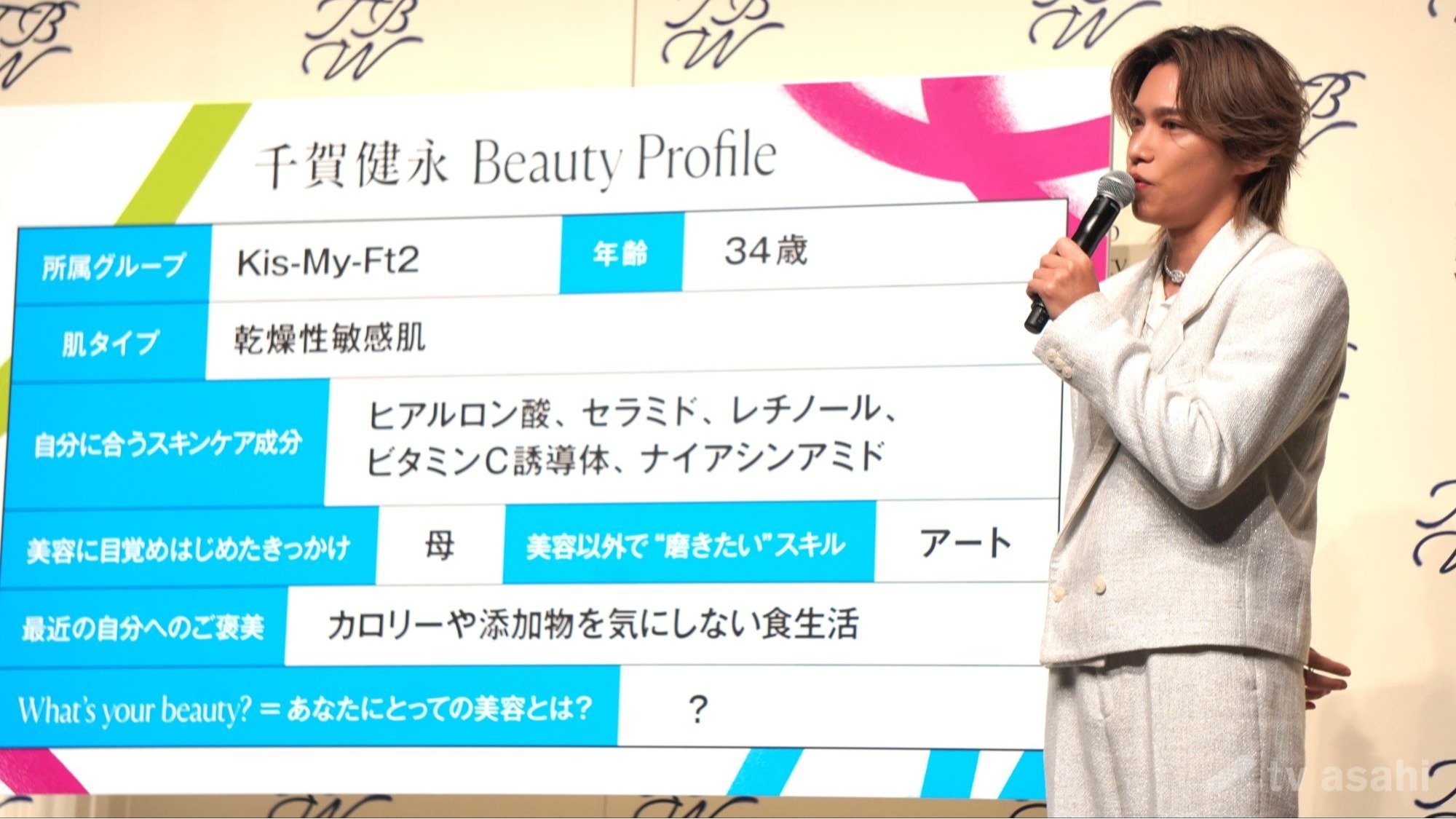 この日は、「千賀健永 Beauty Profile」と題し、自身の肌タイプなどのパーソナルな情報のほか、美容にまつわるトークを繰り広げた。「あなたにとっての美容とは?」と聞かれると、「美容はコンプレックスからの脱却。コンプレックスってネガティブなイメージがあると思うんです。だから、“過去の自分と楽しみながら向き合うための概念”なのかなと思います」としみじみと語った。