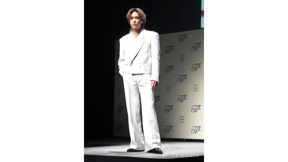 千賀健永は、ランウェーを歩いて登場し、かっこよくポーズを決めた。「少し恥ずかしい思いがあったんですけど、今年Kis-My-Ft2でコンサートをさせていただいた時の、ランウェーを歩くっていうのにリンクしました」と笑顔を見せた。