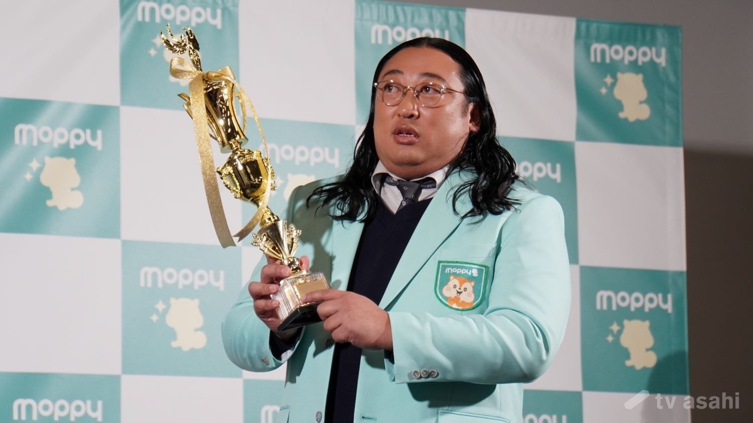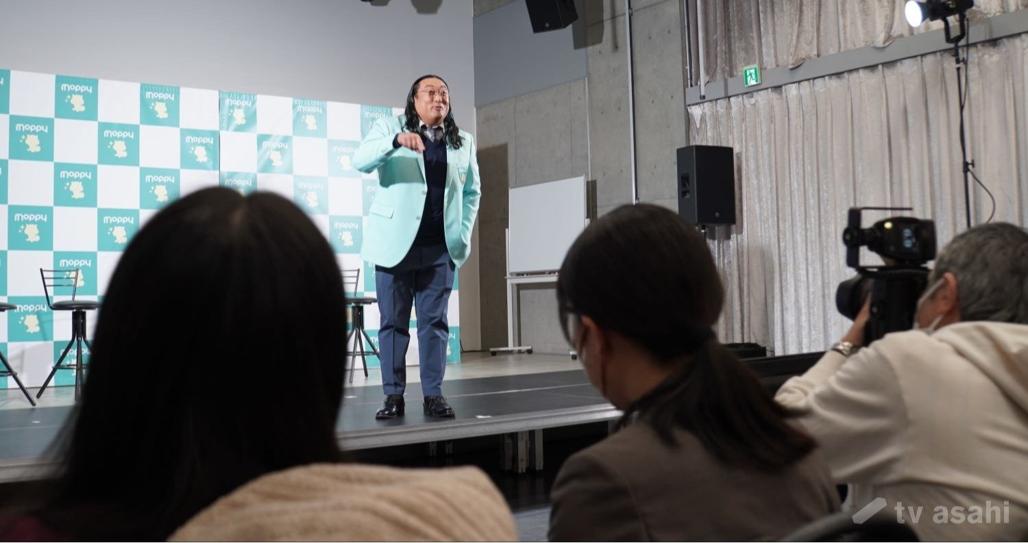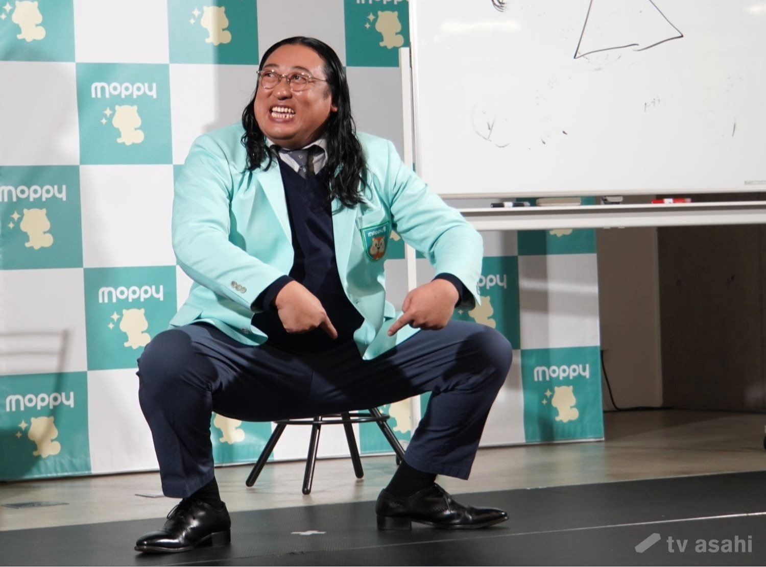 “モッピーポーズ”を考案することになり、どうしても“M”を表現したい秋山最高名誉顧問。「このMが一番有名なんだけどねぇ」と懐かしの“M字ポーズ”を繰り出していたが、こちらとしてはズボンが破れないか気が気じゃなかった。