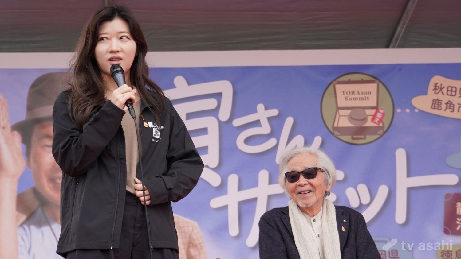 ヒコロヒーは用意されていた衣装を返上し、楽屋で山田監督から贈られた「男はつらいよジャケット」で登壇。これには山田監督もニッコニコ。
