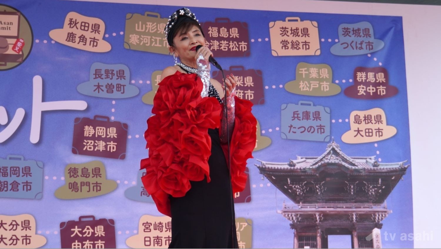 志穂美悦子は白い衣装だったが、シャンソン歌手・鬼無里まりとして登場した際には真っ赤な衣装にお色直し。