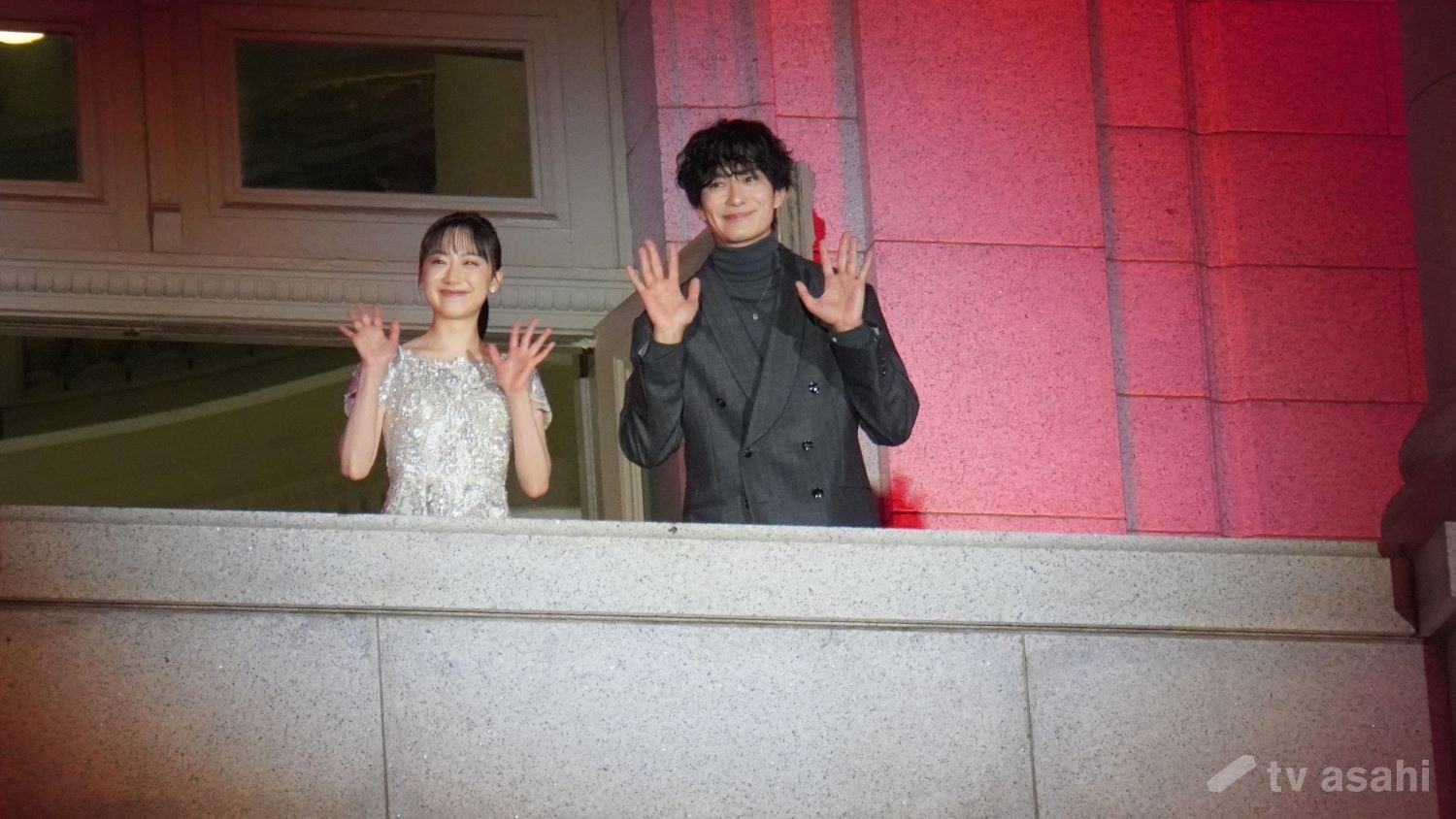 細田守監督の最新作とあり、会場は「時をかける少女」にも登場する東京国立博物館。2階のバルコニーから出て来る芦田と岡田は、プリンセス&プリンスのよう。