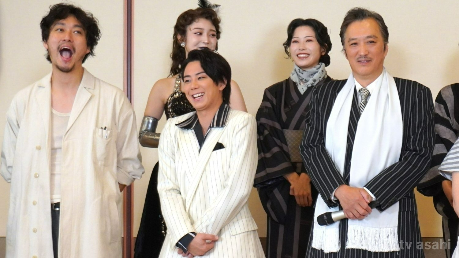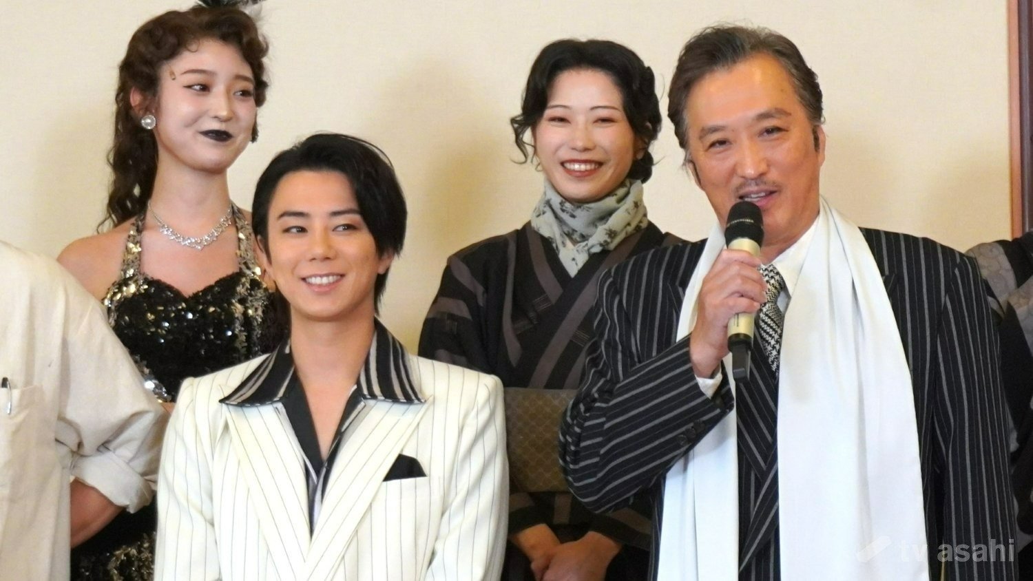大鶴義丹は、北山宏光演じる若いやくざ・松永の兄貴分・岡田を演じる。「私が演じる岡田は、みんなに迷惑と意地悪をする悪いかたき役なんです。まあ、それが今回の私のお仕事なので、とにかくみんなに迷惑をかけて戦っていきたいと思います」と挨拶すると、すかさず北山が「裏だと全然優しいからね〜」とフォローしていた。