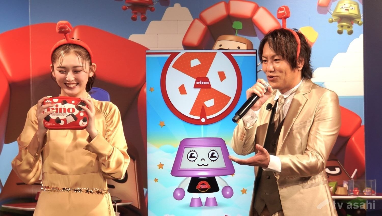 “ピノ英孝”を持った狩野は、ゆうちゃみからピノのピックをイメージした小顔効果もある“ピノポーズ”を伝授され、オドオド(笑)。