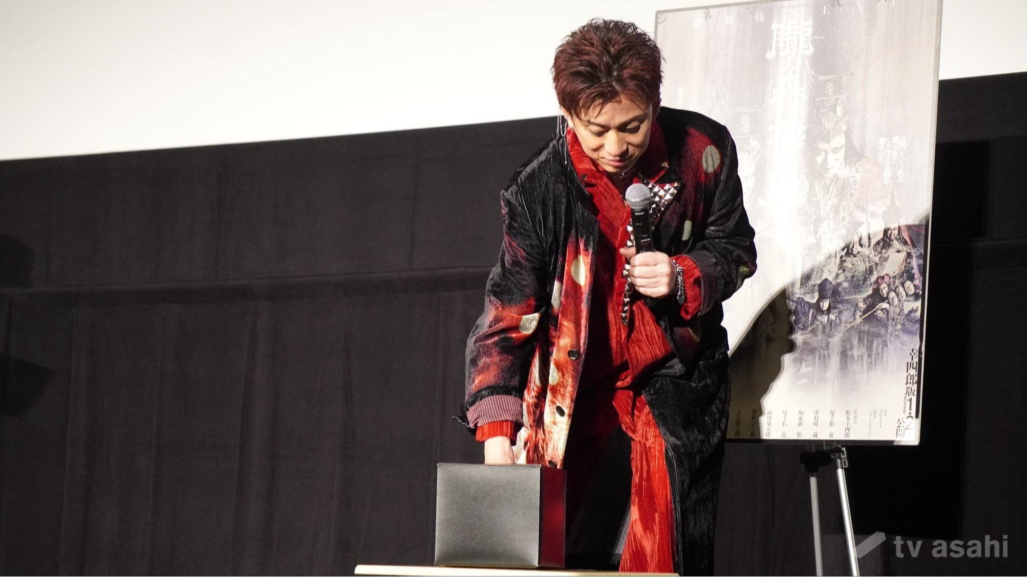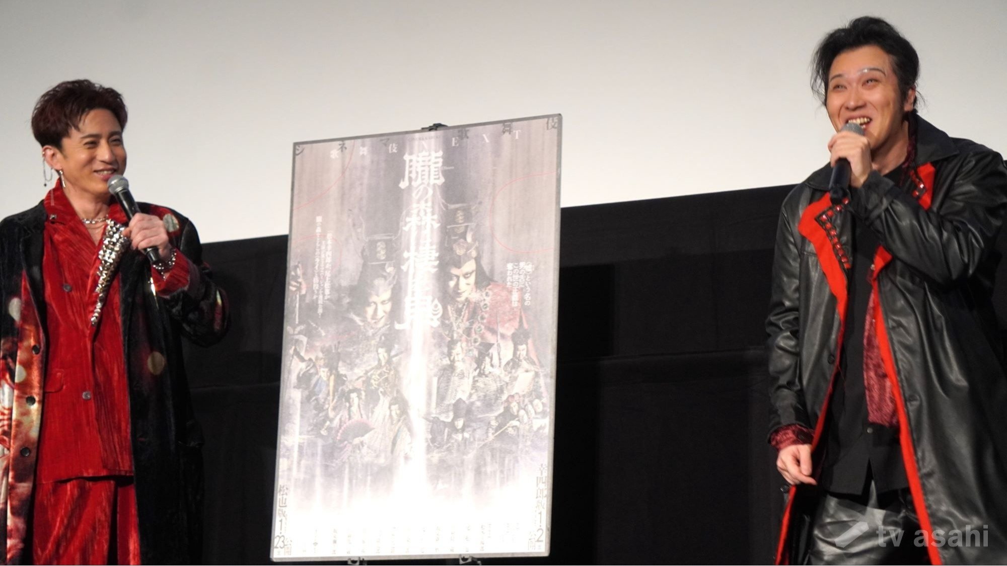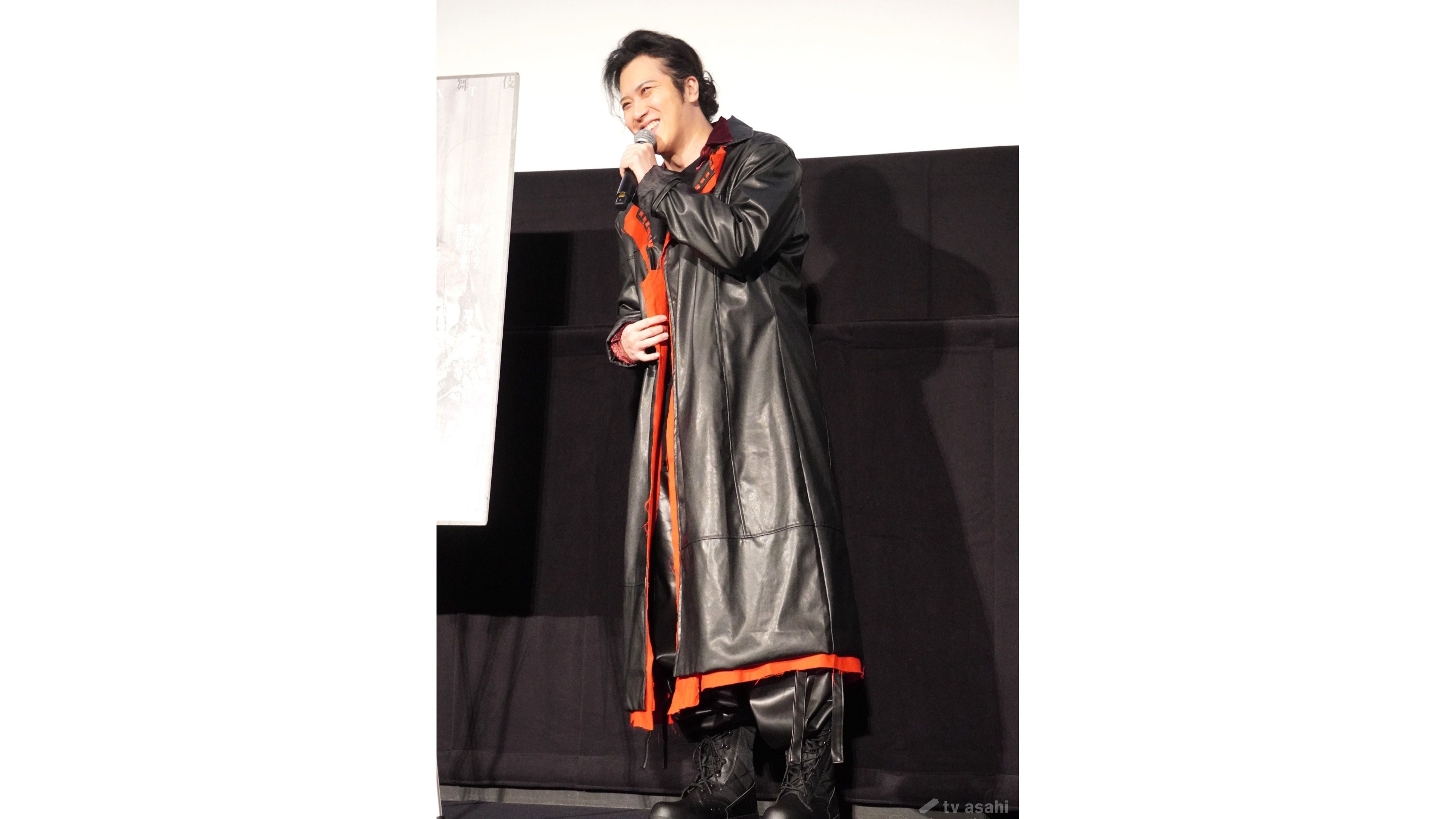 尾上松也は、衣装について「雨が降っても大丈夫なように、レインコート的な(素材)。着心地は良くないですね〜。作業のズボンみたいで、悪い男をイメージしてって言われたんですけど、正直うまくいっていません」と笑った。