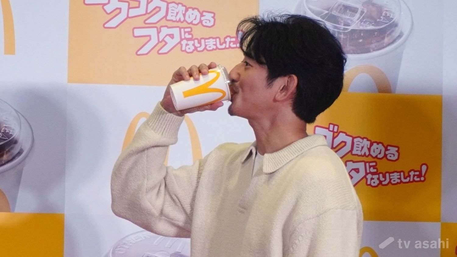 永山瑛太は、ストローなしで飲めるフタ(ストローレスリッド)で飲み物を試飲。「飲みやすいです」と太鼓判を押した。