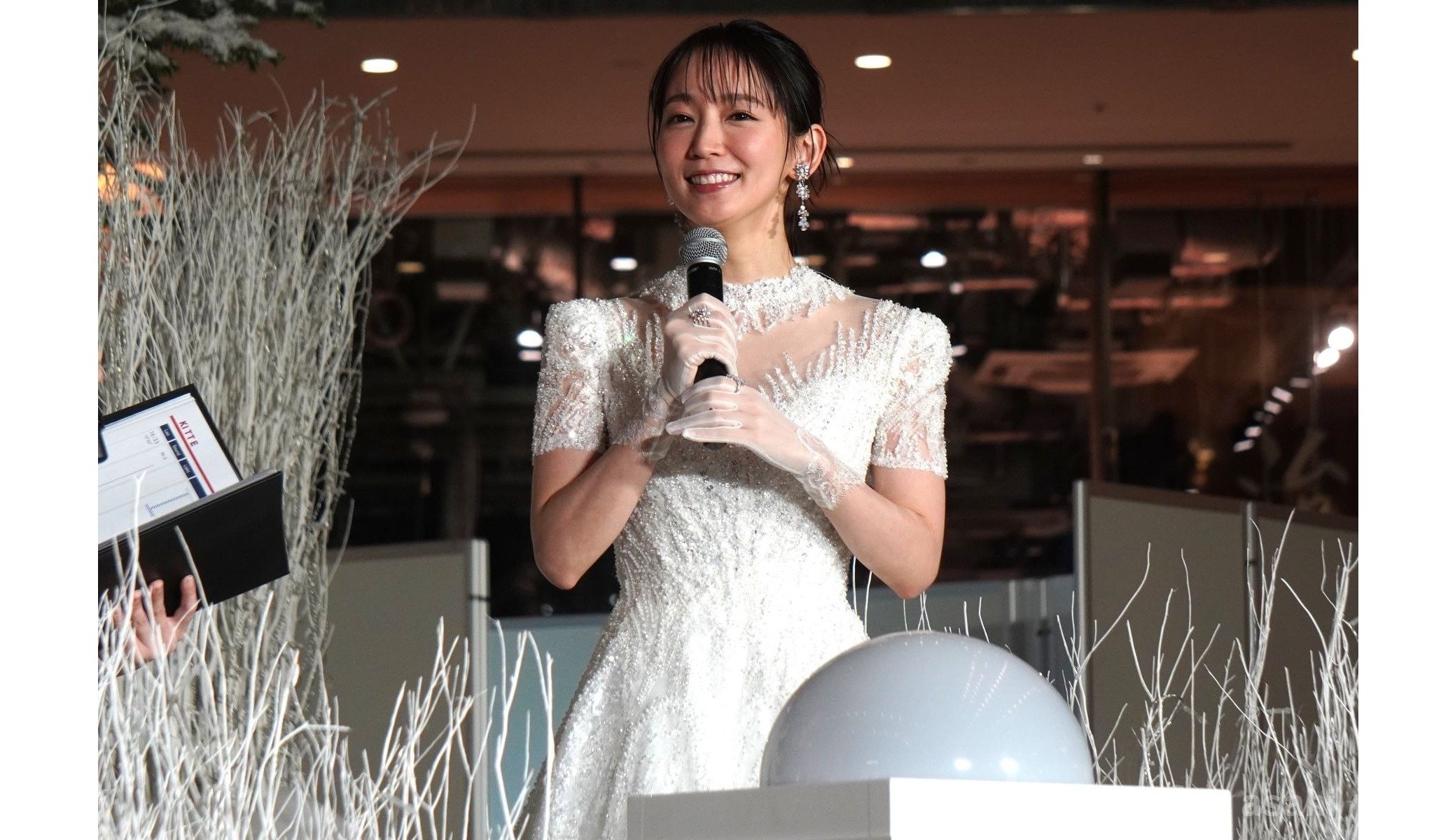 白銀の世界のイメージに合わせ、スパンコールやパールが付いたキラキラのホワイトドレスで登壇した吉岡里帆。