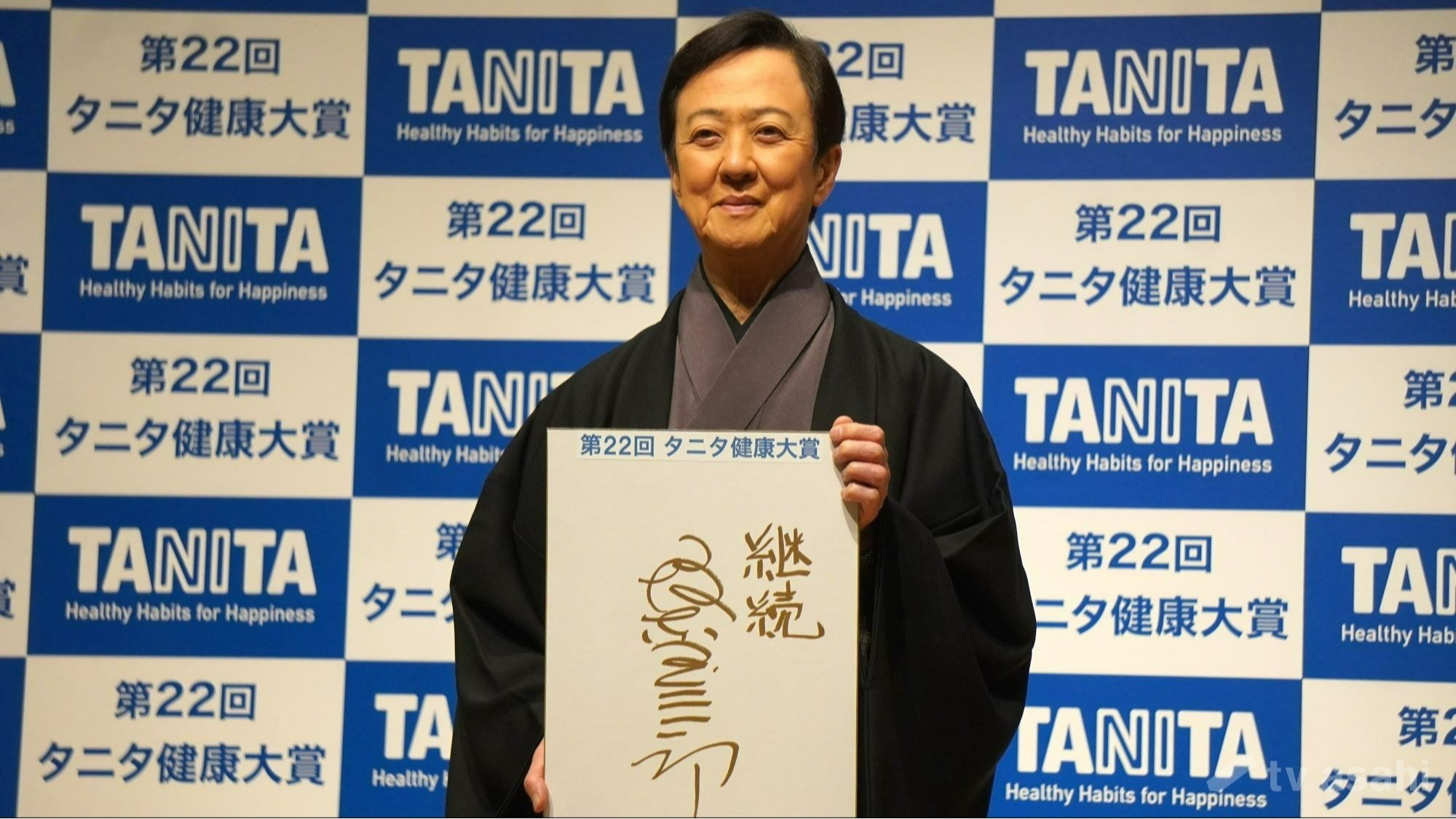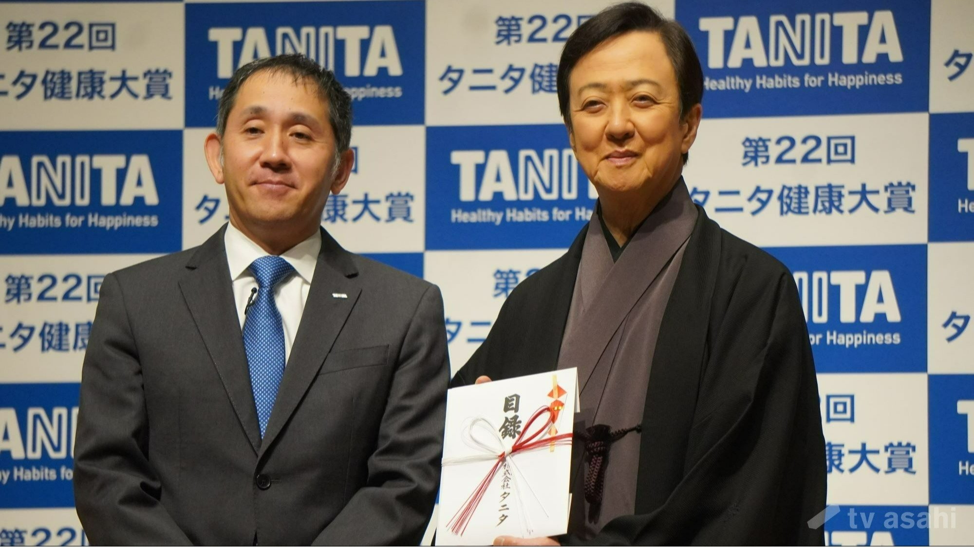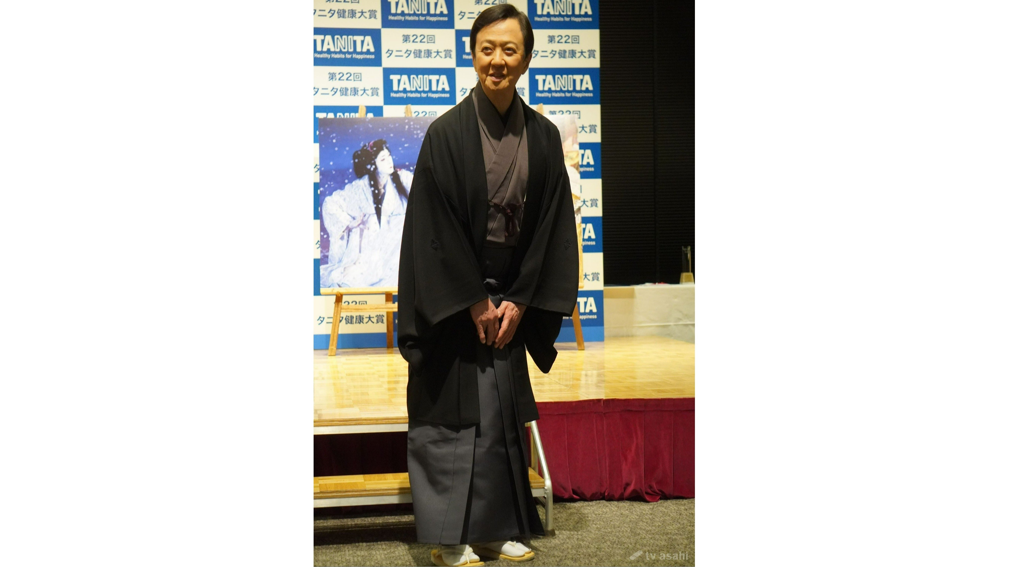 「タニタ健康大賞」を受賞した坂東玉三郎には、賞状、トロフィー、副賞の100万円とタニタの体組成計が贈られた。