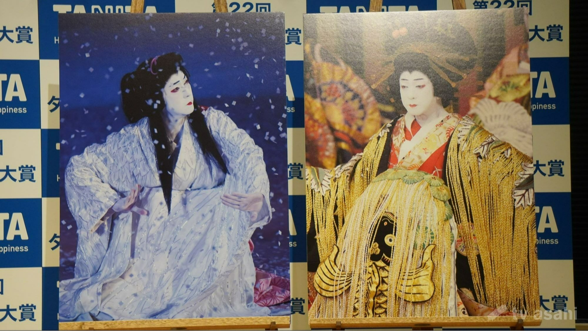 会場には、玉三郎がこれまで演じてきた役の写真が飾られており、衣装の重さを聞かれると、「だいたい10キロから20キロ、一番重いものは40キロ。軽いものでも10キロぐらいはあると思います」と答えた。