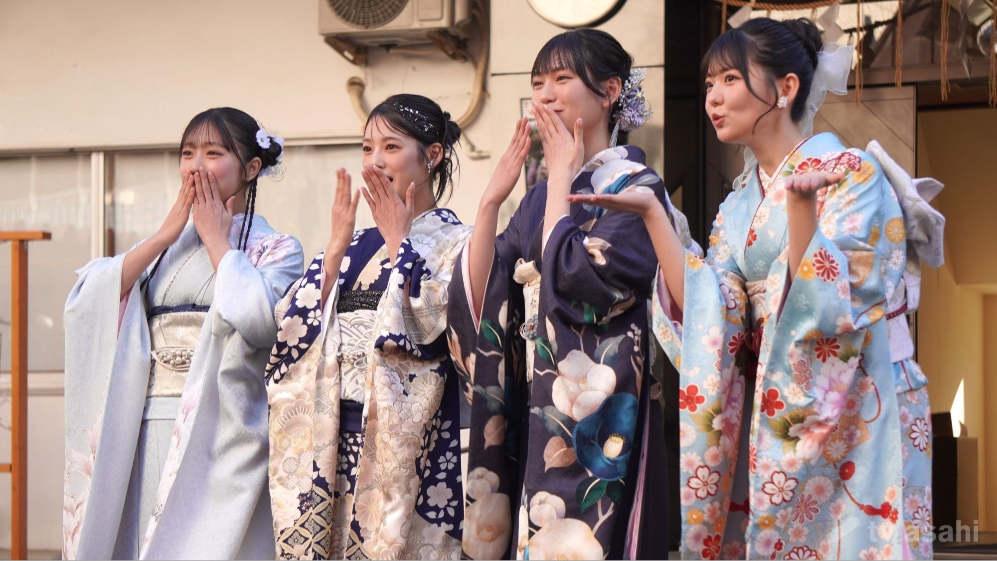 (左から)須永心海、吉本此那、柳堀花怜、今井優希の4人はそれぞれ晴れ着姿で登場した。フォトセッションでは投げキッスをしてくれた。