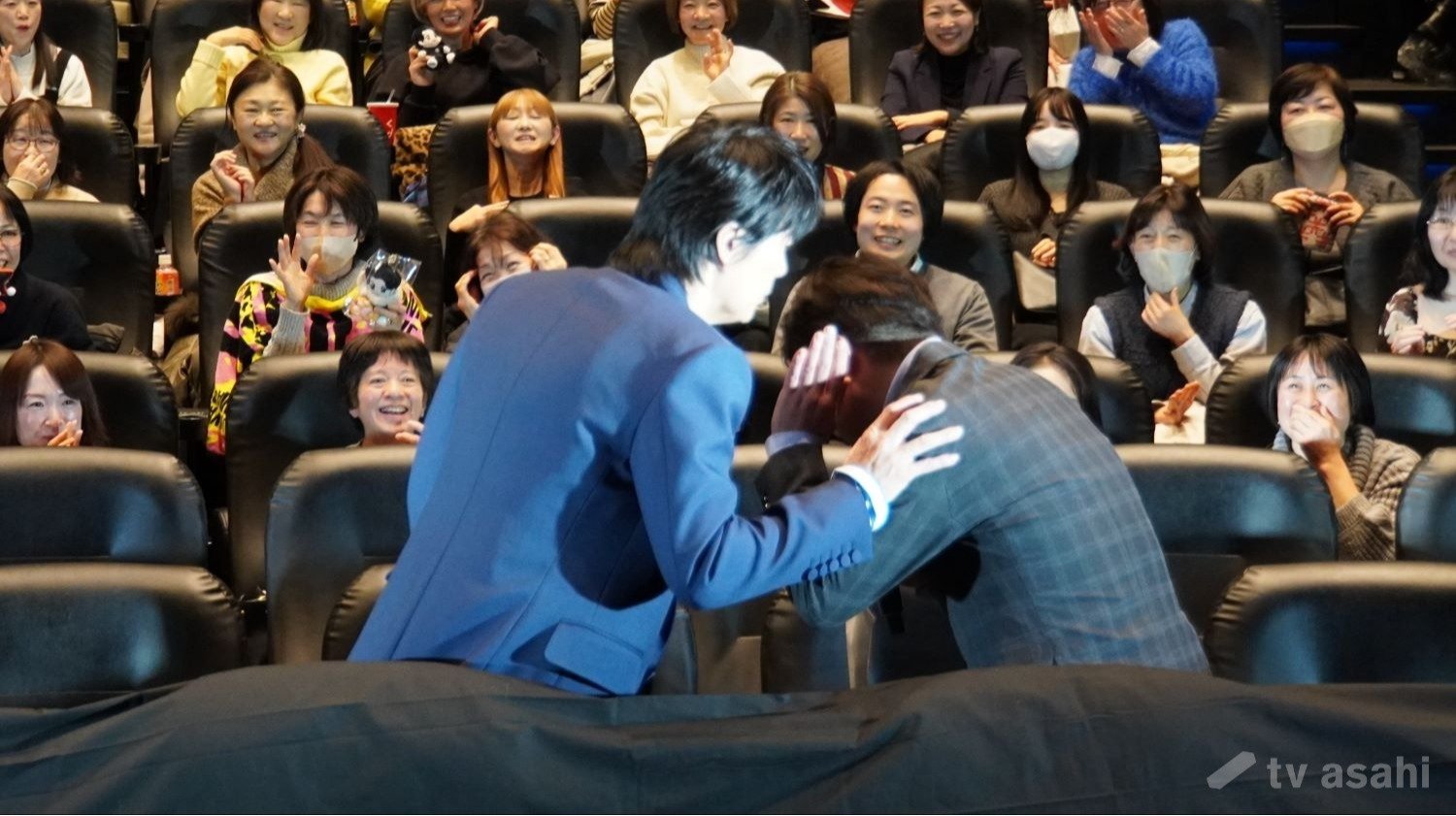 福山のフォトセッション中、客席のファンが静かになるため、司会者を呼び「休むな」と伝言。それだけで元気になる客席。盛り上げ上手です。