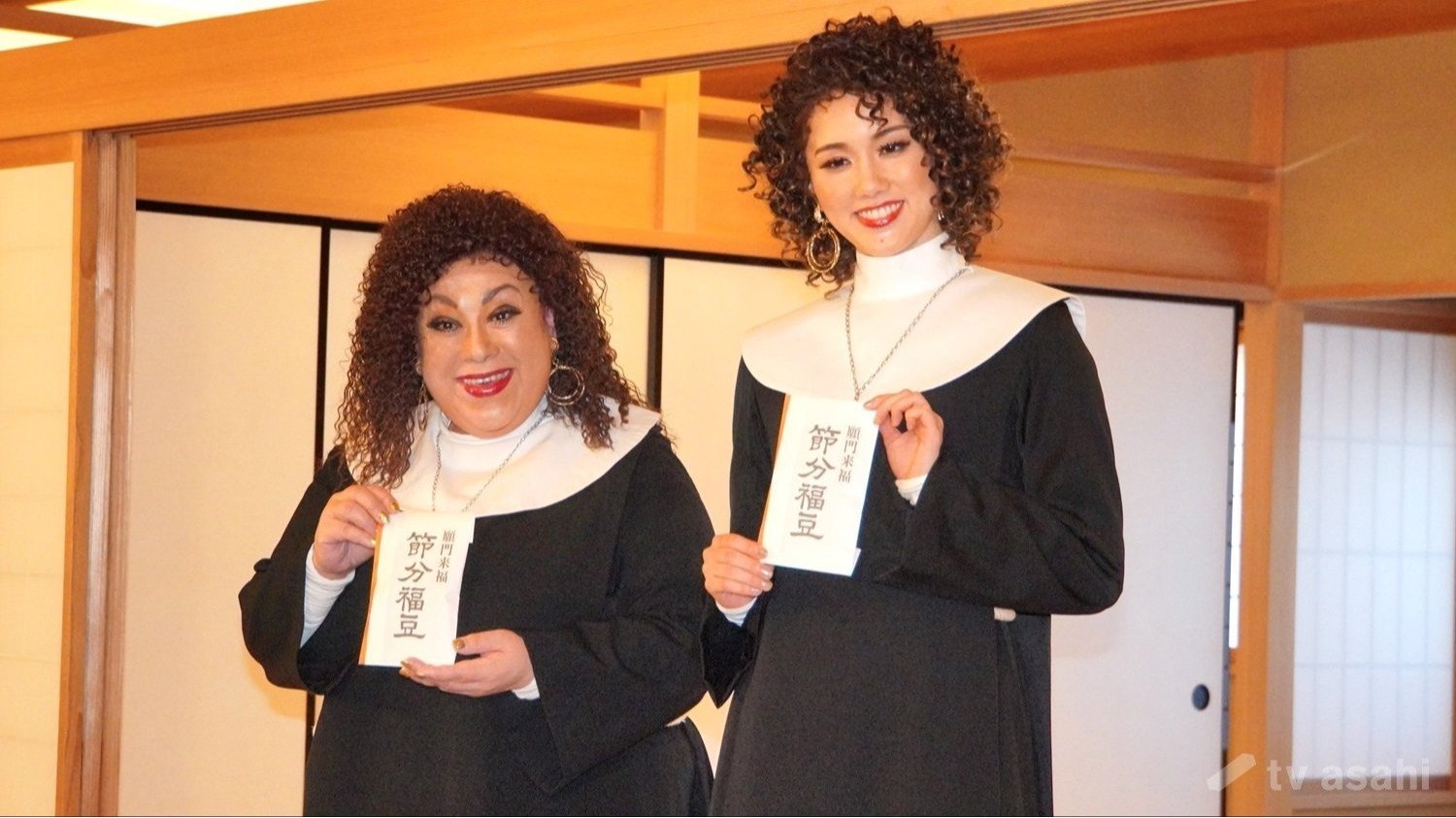 出演ミュージカル「天使にラブ・ソングを〜シスター・アクト〜」の役衣装で参加した二人。彩風は宝塚退団後初のミュージカル出演となり、「体当たりで挑みたい」と意気込み、「プライベートでもスカートをはいたことがない。中学生以来のスカート」とはにかんだ。