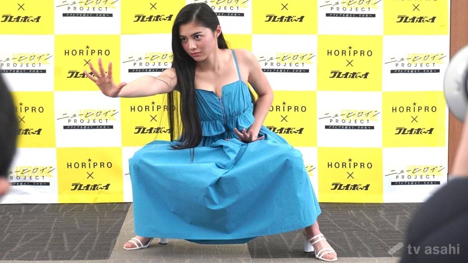 相撲が特技という清埜きり。この日はワンピース&ヒール姿だったが、フォトセッションでは報道陣のリクエストに応えて、得意技の「押し出し」ポーズを全力で披露してくれた。表情も良いです。