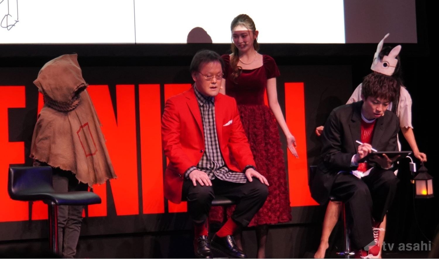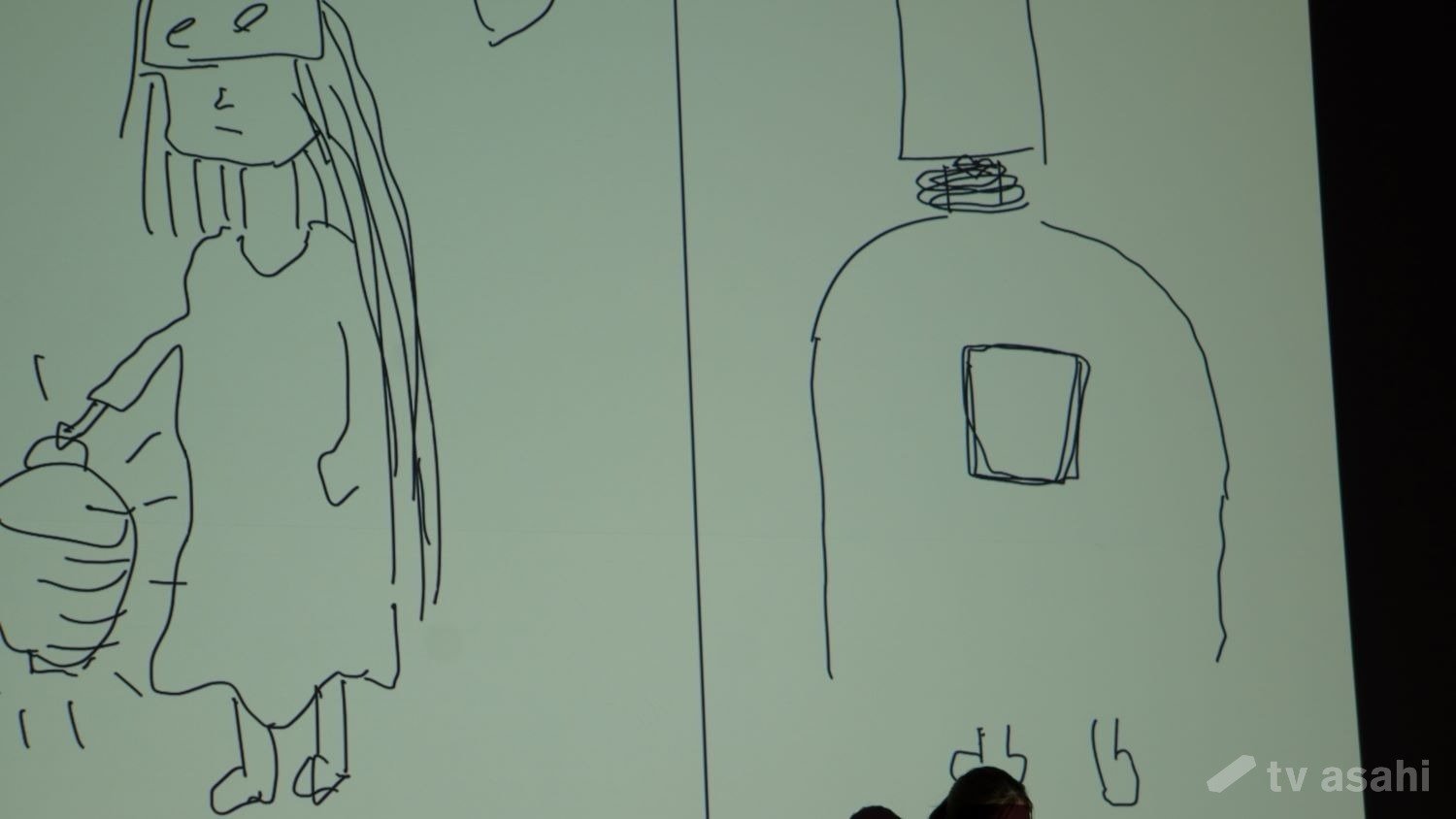 メインキャラクターの姉弟が見守る中、その姉弟をイラストにしたアインシュタインの二人。