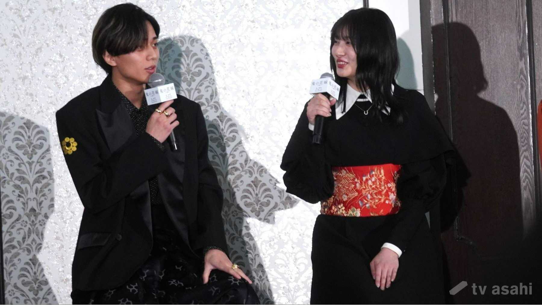 和洋折衷な劇中衣装で登壇した永瀬廉と吉川愛。永瀬は「僕もこれを着ていると(演じた)玲夜モードになります。和の感じもありつつ、ジャケットとかは洋の感じもあって、いいあんばいで個人的にも大好きです」とニッコリ。