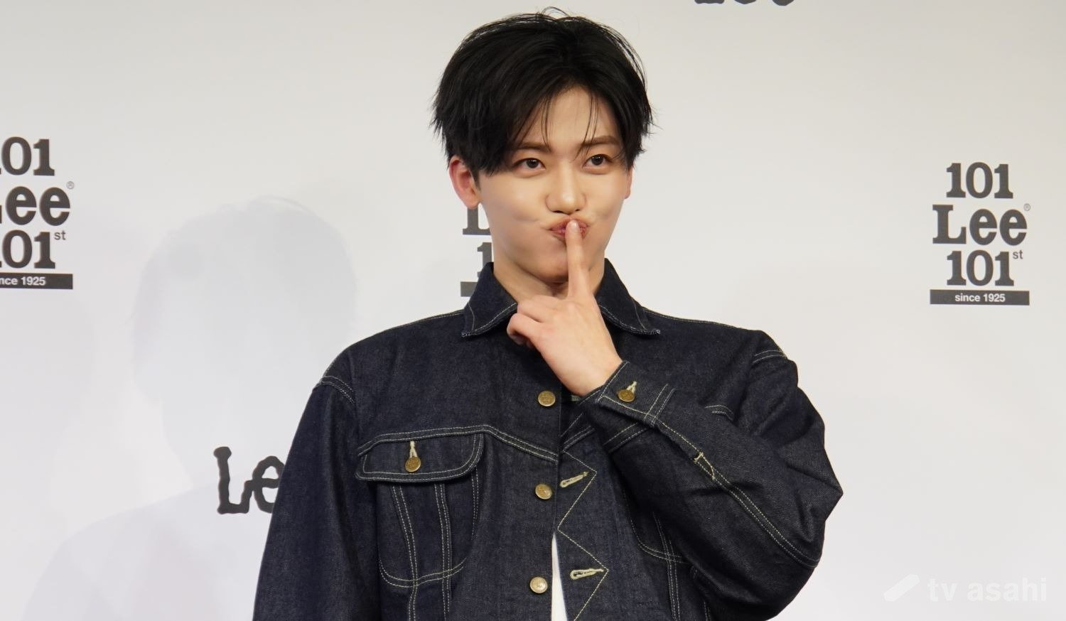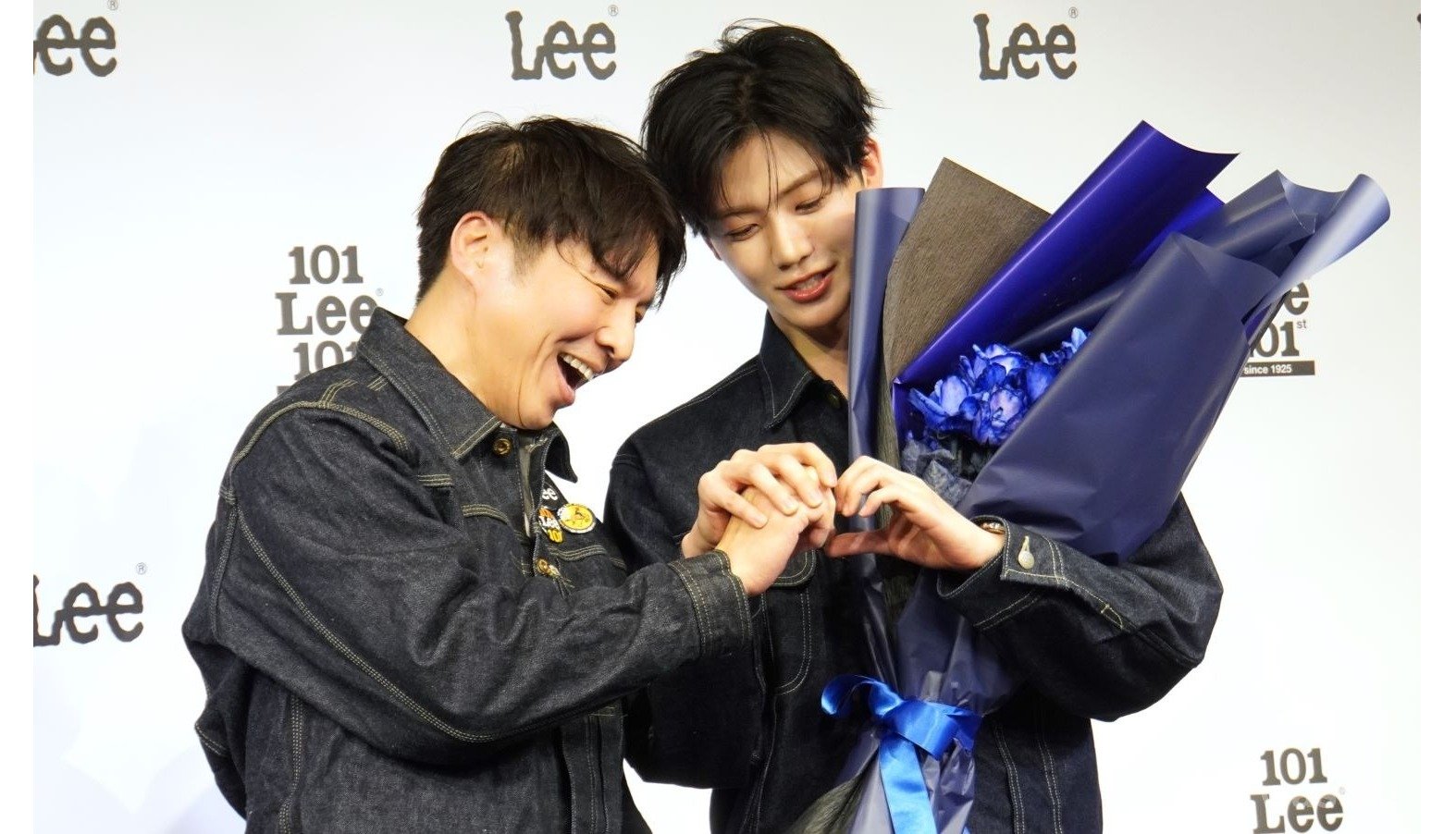 フォトセッションで「Leeジャパン」の社長とハートをするために、教えるJEAMIN。