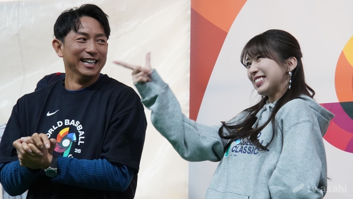 侍ジャパンへ歌でエールを届けた牧野。「LOVEマシーン」の決めポーズに隣のムネリンこと川崎選手もこの笑顔。